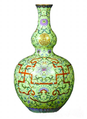 清乾隆 浅黄地洋彩锦上添花万寿连延图长颈葫芦瓶 (2010年10月7日香港苏富比拍出了2.2亿元)
