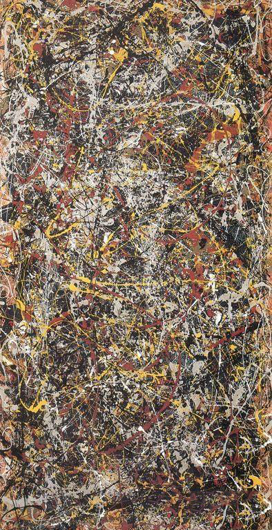 1946年,波洛克开始用“滴洒法”(drip)创作,有点类似中国画中的泼墨,就是将油画颜色调稀或者直接用油漆,用笔或勺滴洒在画布上。波洛克的滴洒 法绘画随意之间隐藏着戏剧性的偶然效果,激情四射而且充满了色彩的自由、张力和狂野,加上他不拘一格,绘画过程中“泥沙俱下”,沙砾、碎玻璃、杂物都敢入 画,他作品技法的独创和视觉效果的另类给当年美国艺术带来极大的震动,被视为是摆脱欧洲影响的美国抽象艺术时代的开始,是美国自由精神的象征。《1948 年第5号》是杰克逊·波洛克“滴画”中的精品,画布被钉在纤维板上,画布上的颜色有黄色、白色、栗色以及黑色,画面在看似随意的泼洒中,狂野而富有张力的 色彩线条有着自身的逻辑,隐藏着戏剧性的偶然效果,画家也在移动中即兴而刻意地编排着视觉音乐的节律。这幅作品于2006年11月3日拍卖出全球绘画作品 最高价,达1亿4千万美元,收购名画者是一位墨西哥金融家。这幅画1949年春季展出。当时波洛克画价大约在1平方米400美元,此画约3平方米,价格在 1200美元左右。至今此画涨了约11000倍,平均每年涨幅200多倍。