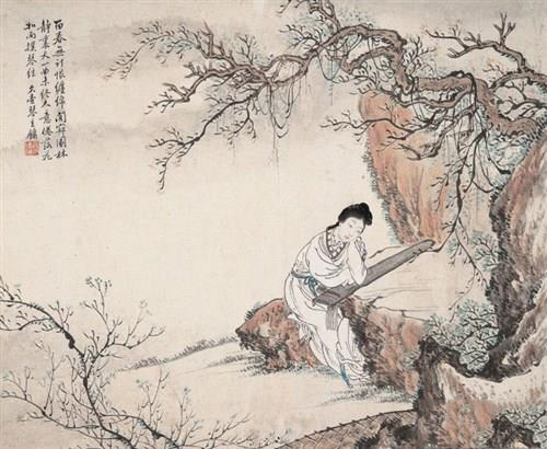 此幅作品构图饱满,画面景物布置匠心独具,巧妙地营造出既空灵通透,又和谐静谧的佳境,并由此真切表达了作者思慕高洁的情愫和“雪满山中高士卧,月明林下美 人来”的诗意寄怀。作于乙酉(1909)年,时处乱世,与这样纯美沉静的艺术营造的世界形成很大反差。这也是潘振镛仕女画一贯的风格,雍容、儒雅、清雅, 没有一丝甜俗的感觉。看似相当传统的仕女图,而又有颇耐咂摸的内涵在里面。