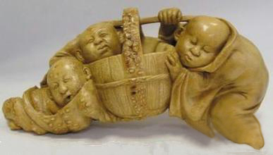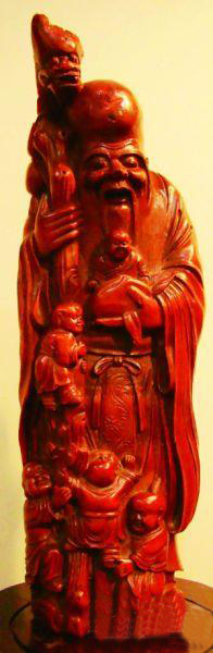 我挑中的一件是老竹根雕寿星(如图),高为45厘米,最宽处为14厘米。虽然我见过不少寿星雕件,但结构都过于普通,大致都差不多,而这件竹根雕复杂多了,外观更有特色,除了寿星,还有5个倚在身旁的童子,童子神态各异,分布在寿星身上不同的位置,摆出各种姿势,可爱极了。老人说,5个童子寓意五福祝寿。整个雕件雕工精细,线条流畅平滑,栩栩如生,虽然经历了不少年代,但竹根材质紧密,包浆老到,十分完美。